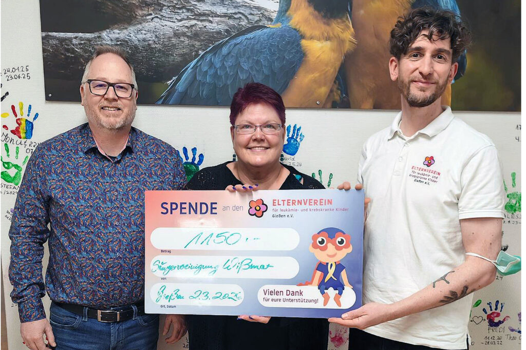 (vm).Zur Spendenübergabe an den „Elternverein für leukämie- und krebskranke Kinder Gießen e.V.” trafen sich zum Wochenbeginn vor der Station Peiper der Unikinderklinik Philipp Joester, Erzieher und Mitarbeiter im siebenköpfigen Team des Elternvereins sowie Andrea Ohrisch und Mike Mülich vom Vorstandsteam der Sängervereinigung Germania-Eintracht Wißmar. Überreicht wurde der Erlös aus dem gelungenen Weihnachtskonzert der Sängervereinigung vom vergangenen Dezember. Auch hatten die Chorleiter*innen auf ihre Weihnachtsgeschenke verzichtet, um den dafür veranschlagten Betrag dem guten Zweck zukommen zu lassen. Das Spendenziel auszusuchen, oblag dem gemischten Chor der Sängervereinigung, der sich für den regionalen Bezug nach Gießen entschied. Mit der Spende sollen die vielfältigen Aufgaben des Elternvereins unterstützt werden, die von den Mitarbeitern mit viel Herzblut umgesetzt werden (www.krebskrankekinder-giessen.de). Freunde des Chorgesangs möchten wir hier bereits vorab auf das Jubiläumskonzert von „Vocal pur” (Chor der Sängervereinigung) am 20.6.2026 um 19:00 Uhr in der Johanneskirche in Gießen zu dessen 30-jährigem Bestehen hinweisen. Auch dort wird bei freiem Eintritt um Spenden gebeten werden, um ein noch festzulegendes Projekt der Organisation GAiN zu unterstützen. Mehr unter www.saengervereinigung-wissmar.de